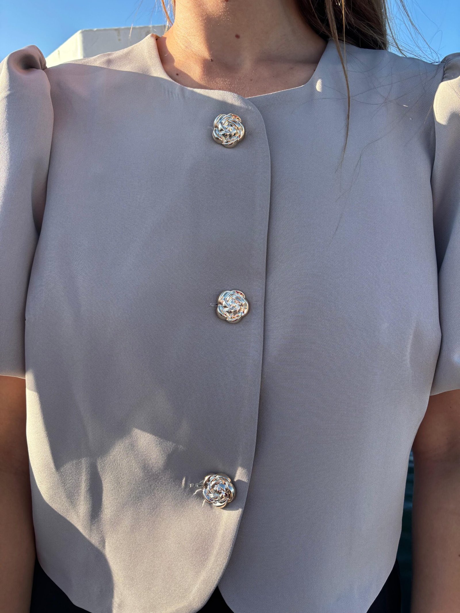 De top is one size en heeft een comfortabele pasvorm die soepel meebeweegt. Het blazer-achtige model maakt hem perfect om zowel casual te dragen met een jeans als chic te stylen voor een avond uit.