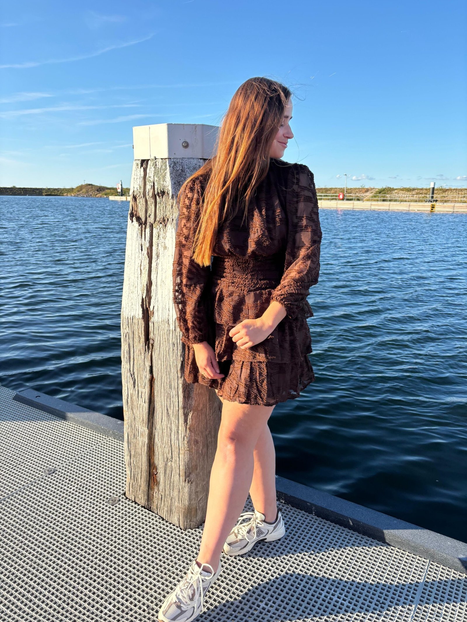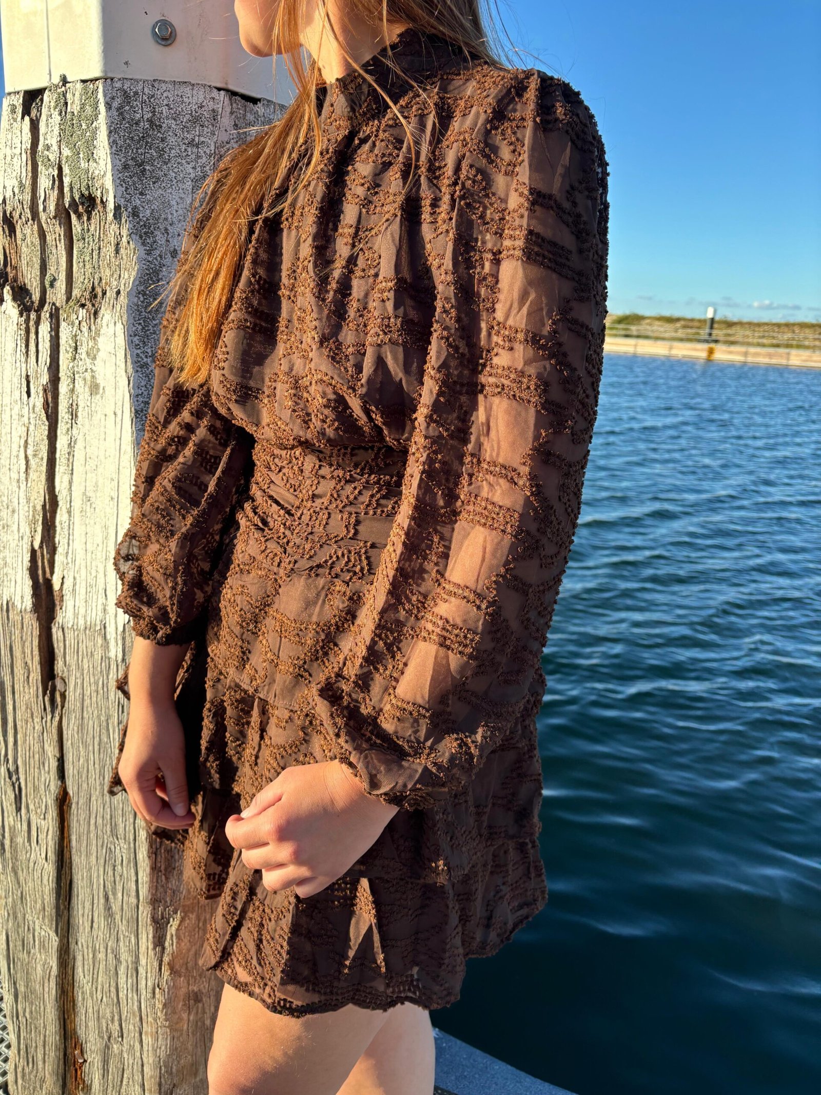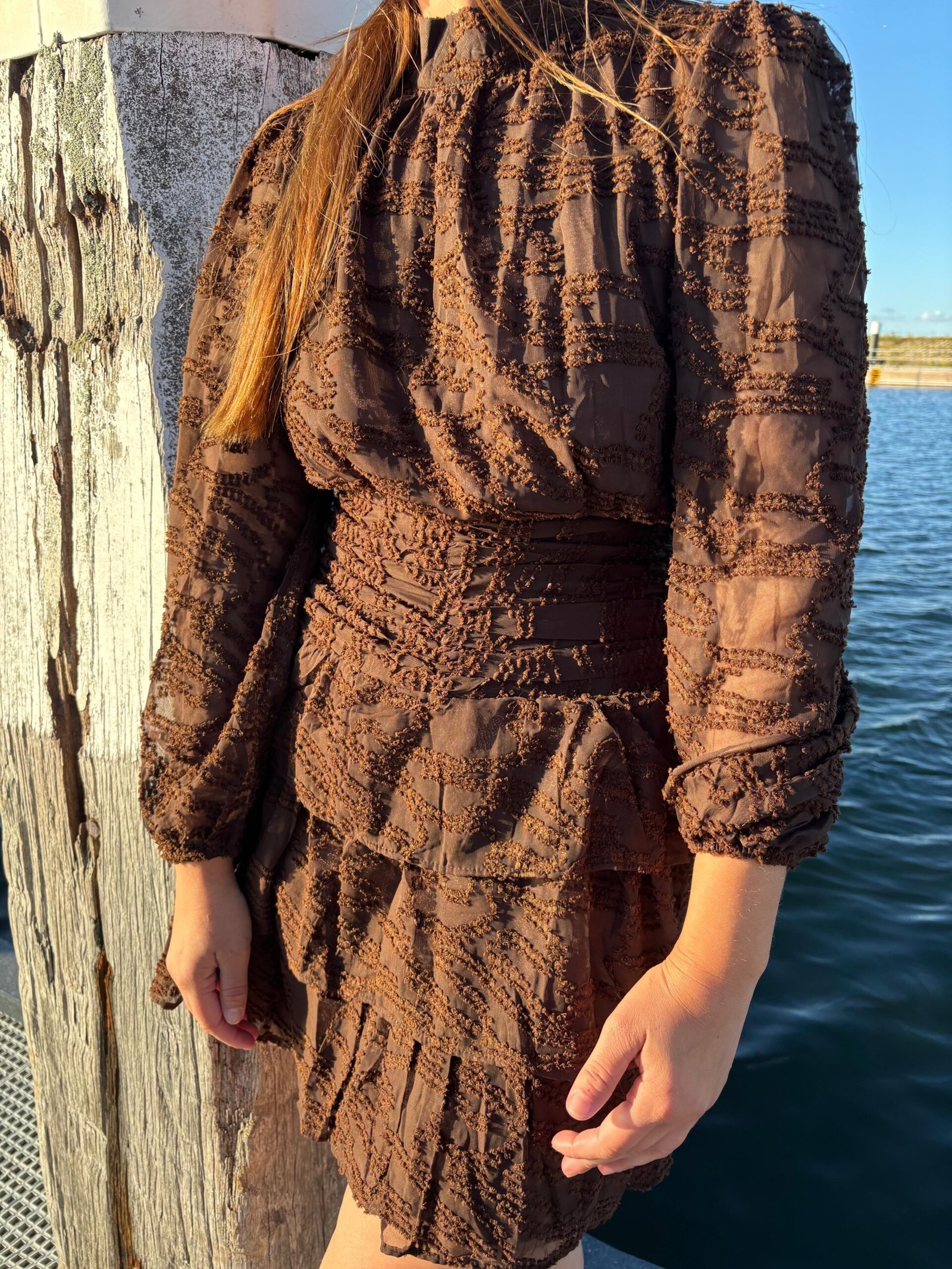 Dit ruffle jurkje in donkerbruin straalt vrouwelijke charme uit. De ruffles geven een speelse en elegante look, terwijl de rijke donkerbruine kleur zorgt voor een chique uitstraling. Het jurkje is verkrijgbaar in de maten S, M en L, zodat je de perfecte pasvorm kunt kiezen.